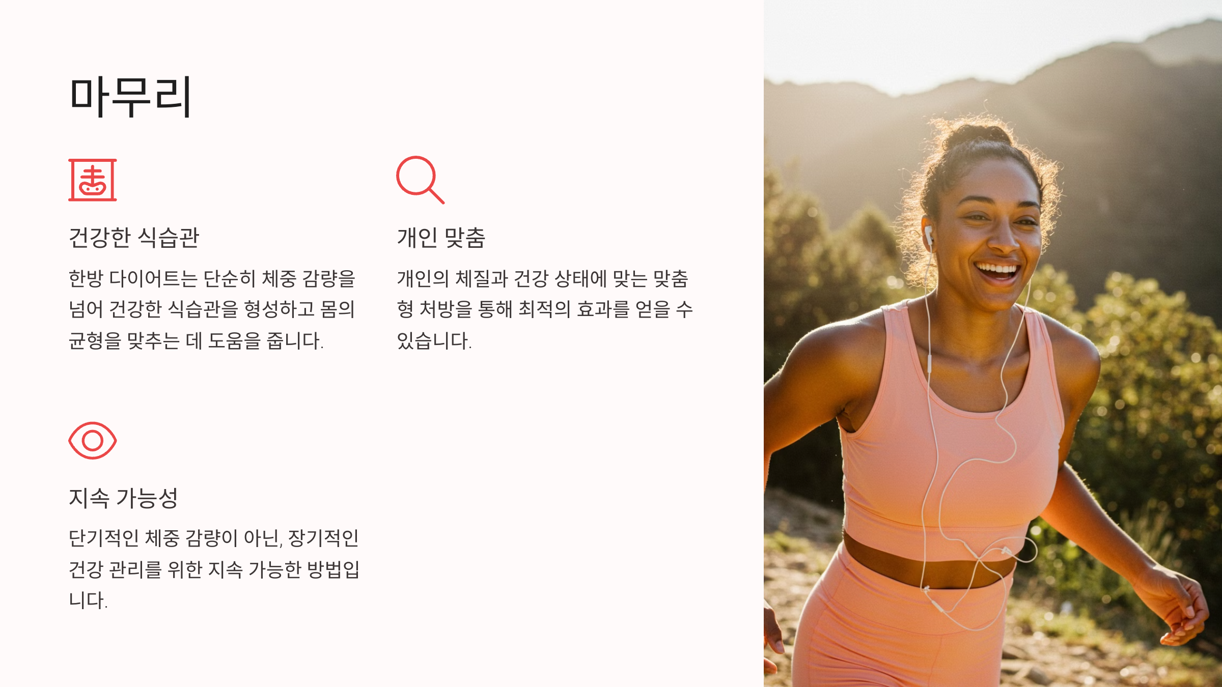 한방 다이어트는 단순한 체중 감량을 넘어 건강한 몸을 만드는 과정입니다. 단순히 체중 감량을 목표로 하는 것이 아니라, 체질을 고려한 접근법을 통해 신체의 균형을 유지하면서 건강하게 감량하는 것이 핵심입니다. 체질별 맞춤형 접근을 통해 효과적으로 체지방을 줄이고 요요현상을 방지할 수 있습니다.