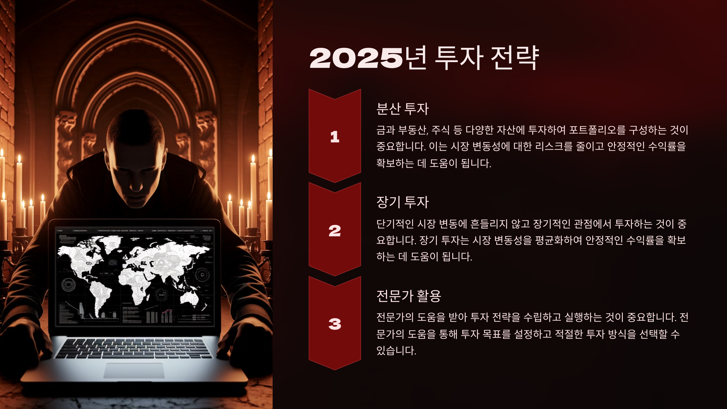 경제 불확실성이 지속되는 상황에서 금과 부동산을 적절히 분산 투자하는 것이 중요합니다. 금은 단기적인 시장 변동성을 헤지하고, 부동산은 장기적인 자산 증식과 현금 흐름 창출을 가능하게 합니다.