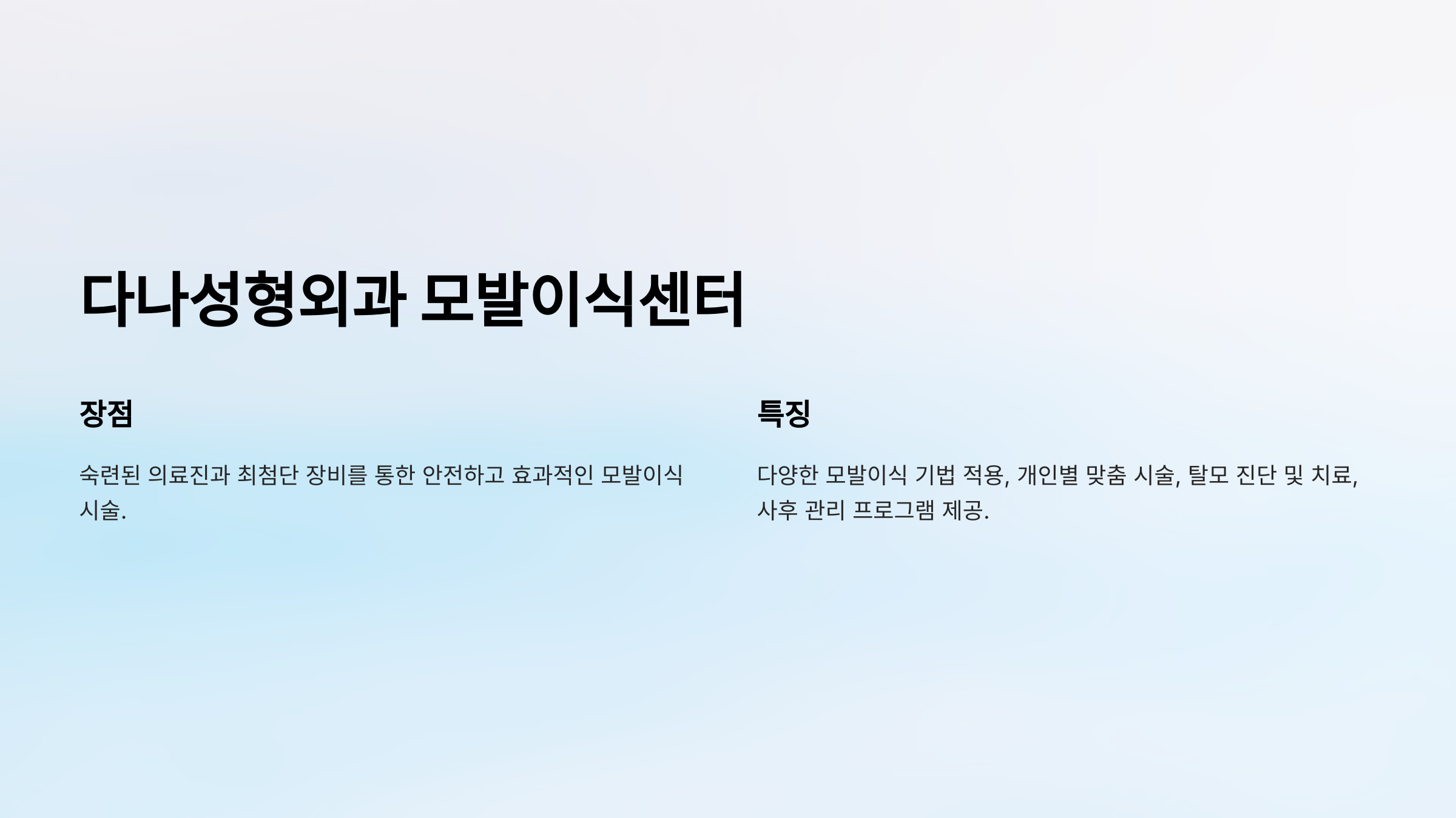 특히 다나성형외과는 자연스러운 헤어라인 디자인에 강점을 갖고 있어요. 최신 모발이식 기술을 활용하여 정밀하게 모낭을 배치하며, 개인의 얼굴형과 조화를 이루는 헤어라인을 설계합니다. 또한, 수술 후 관리가 철저하게 이루어져 수술 후 회복과 유지가 용이합니다.