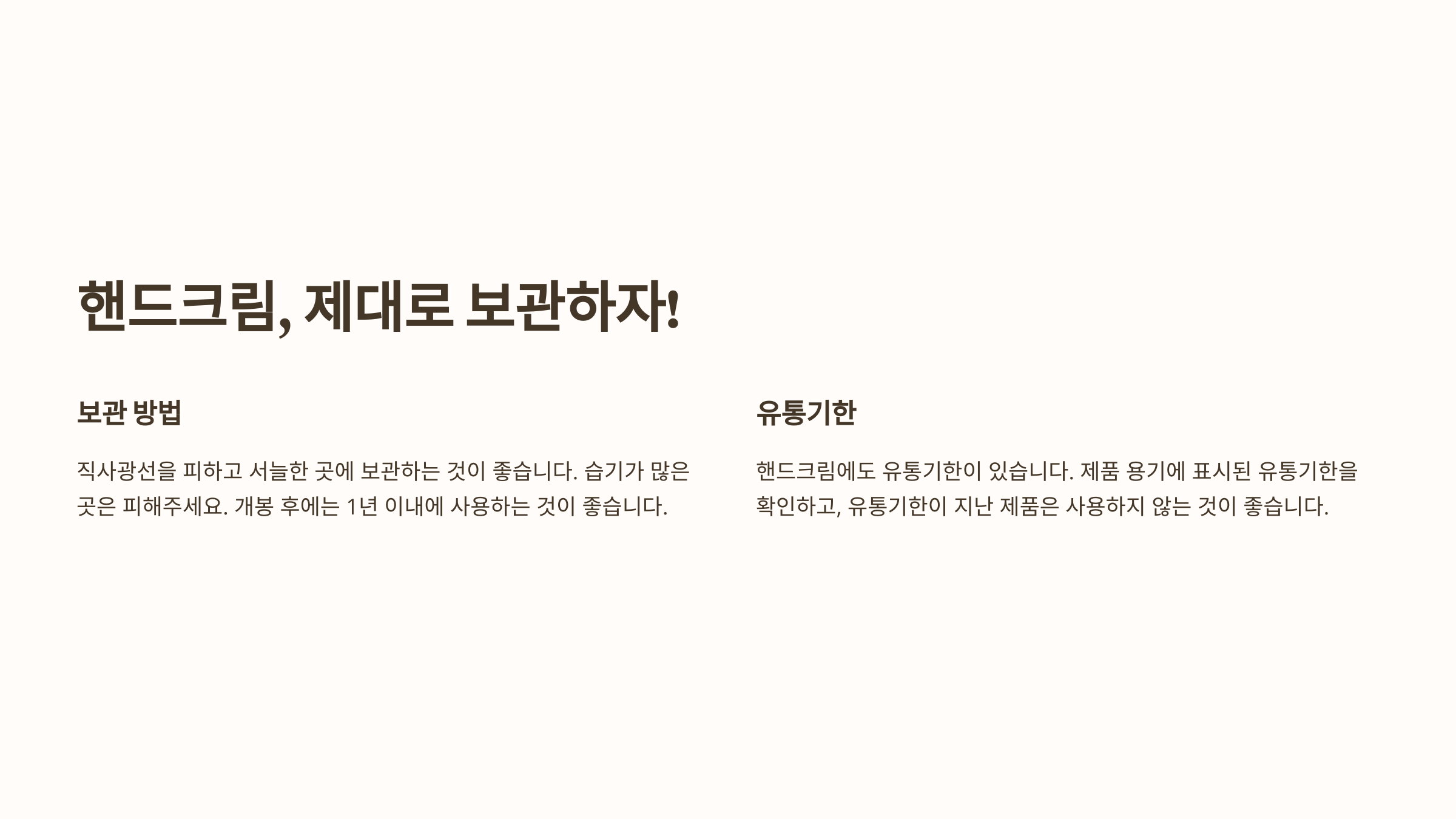 - 개봉 후 6~12개월 내 사용 - 오래된 핸드크림은 효과가 줄어들고, 변질될 수 있어요.
