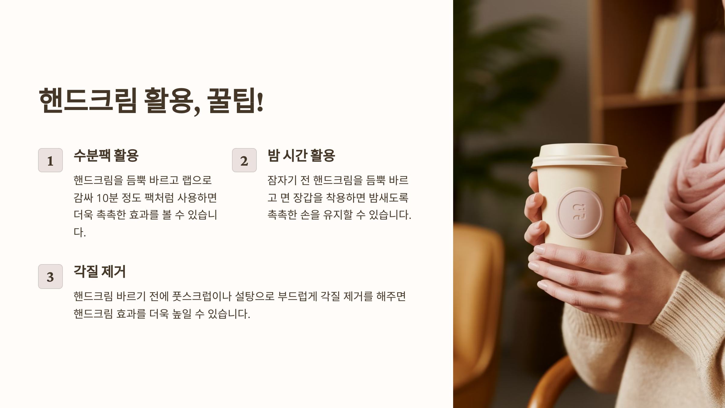 - 밤에는 두껍게 바르고 면 장갑을 착용 (수면팩 효과로 촉촉한 손 완성!)