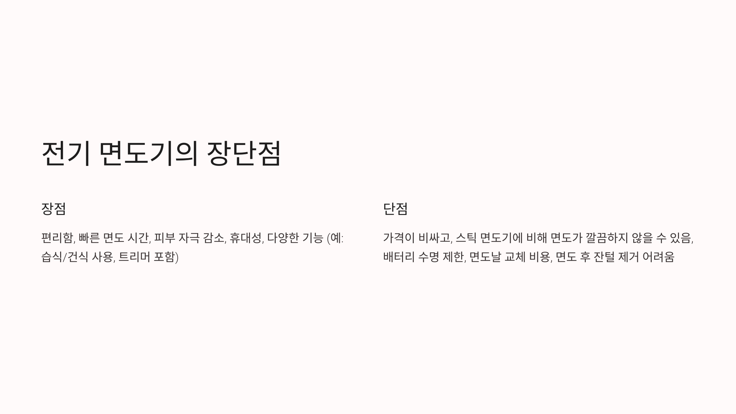 이제 어떤 면도기가 나에게 더 적합한지 감이 오나요? 다음 섹션에서는 각각의 장단점을 더 자세히 살펴볼게요!