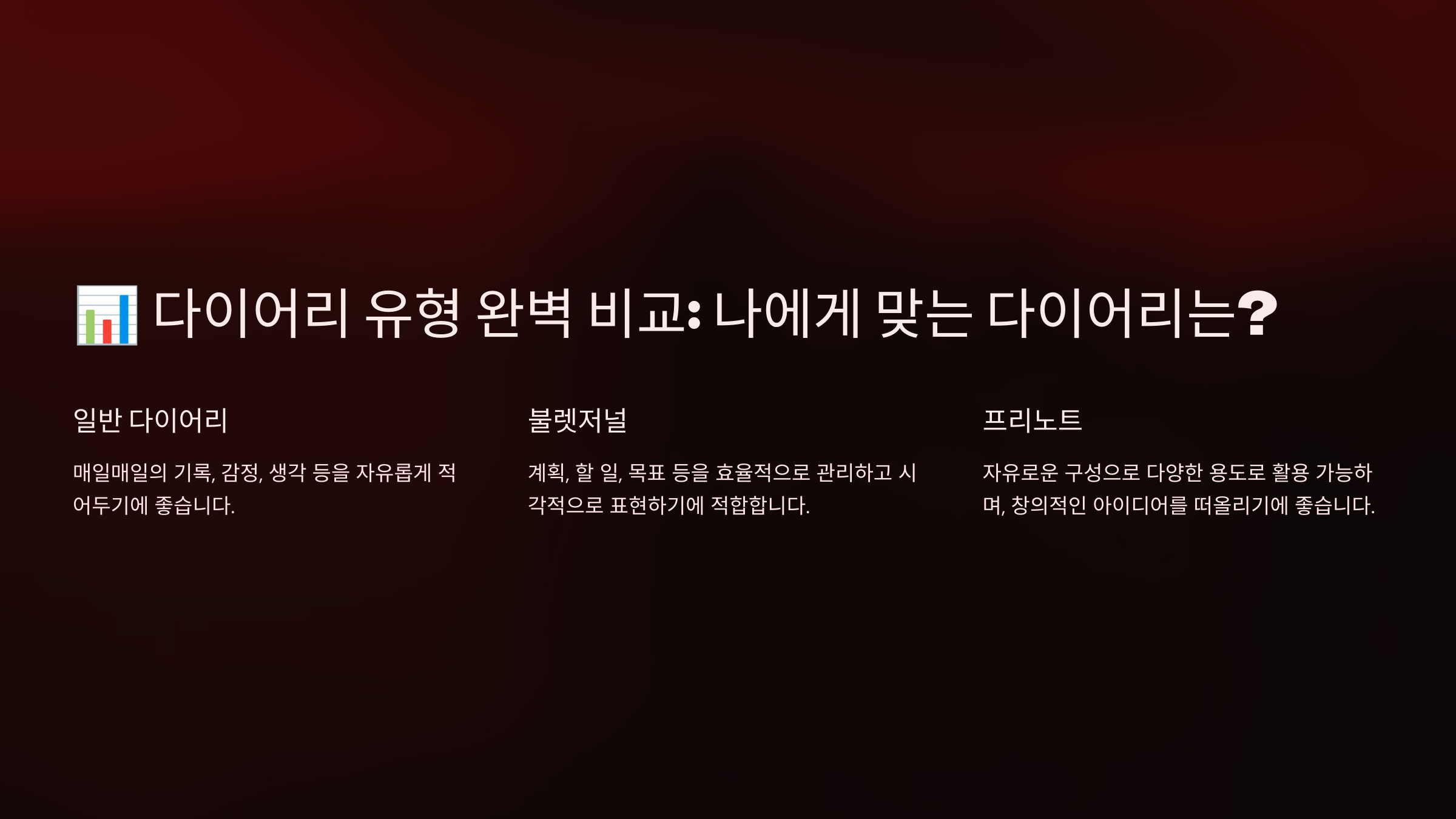| 📱 디지털 다이어리 | 간편한 수정과 검색 기능 제공 | 스마트 기기를 선호하는 사람 |
