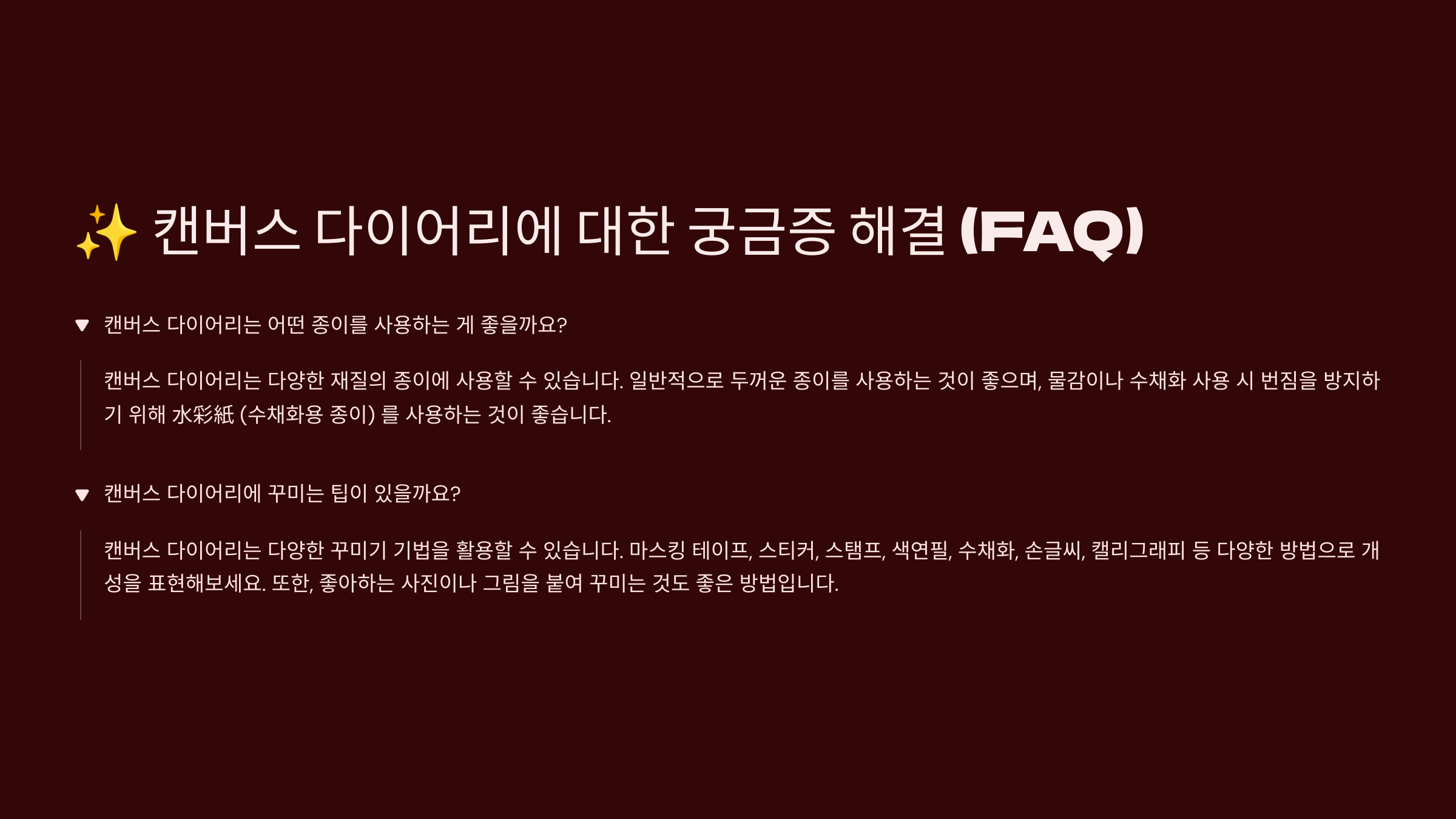 캔버스 다이어리는 단순히 일정이나 해야 할 일을 기록하는 수단을 넘어, 나 자신을 돌아보고 감정을 정리하는 중요한 도구입니다. 꾸준히 쓰다 보면 삶의 패턴을 파악하고, 목표를 달성하는 데 큰 도움이 될 수 있습니다. 또한, 스트레스를 해소하고 창의성을 발휘하는 데도 효과적이에요.