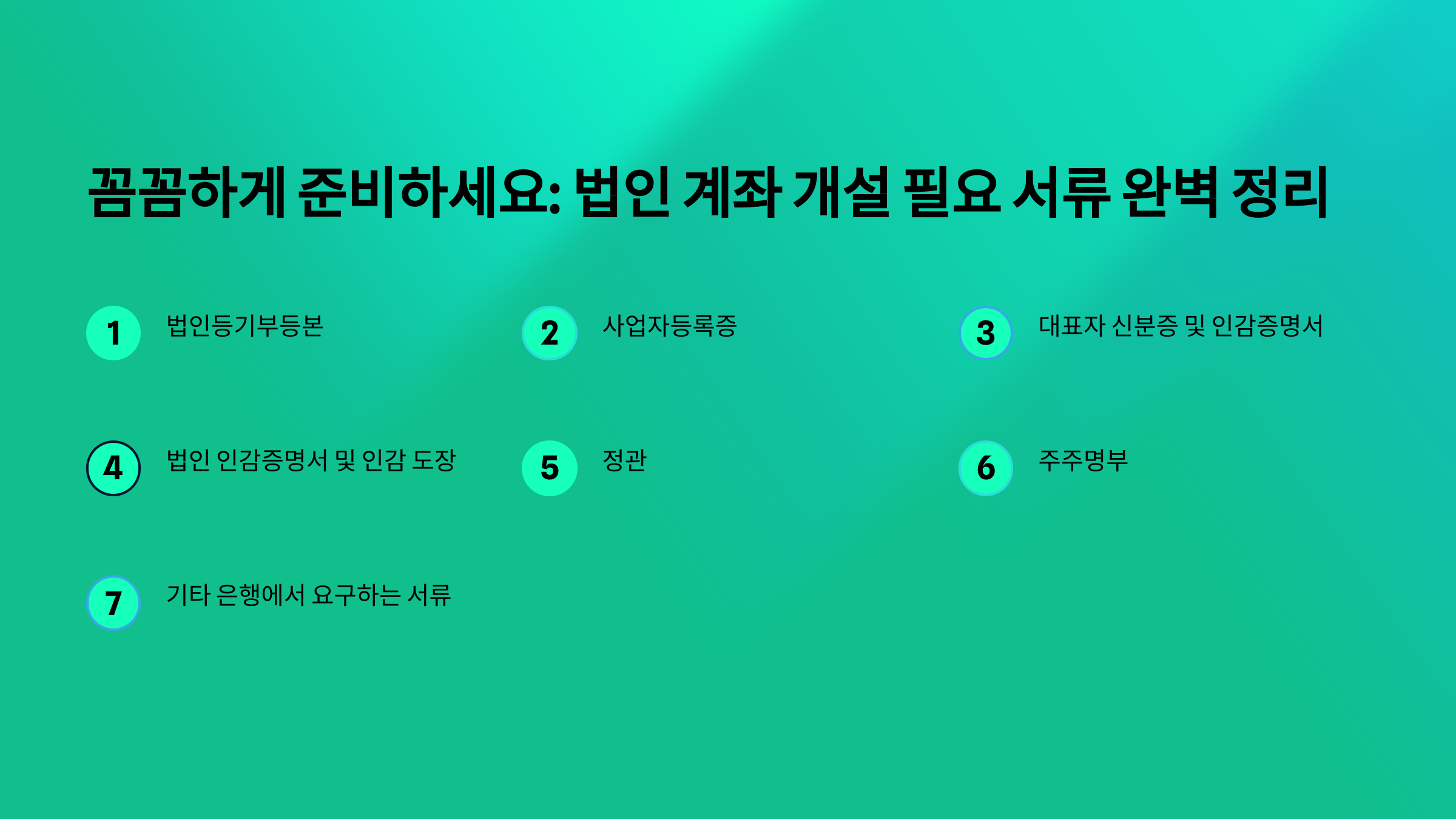 법인 계좌 개설 시 은행에서 요구하는 서류를 철저히 준비해야 합니다. 일반적으로 필요한 서류는 다음과 같습니다.