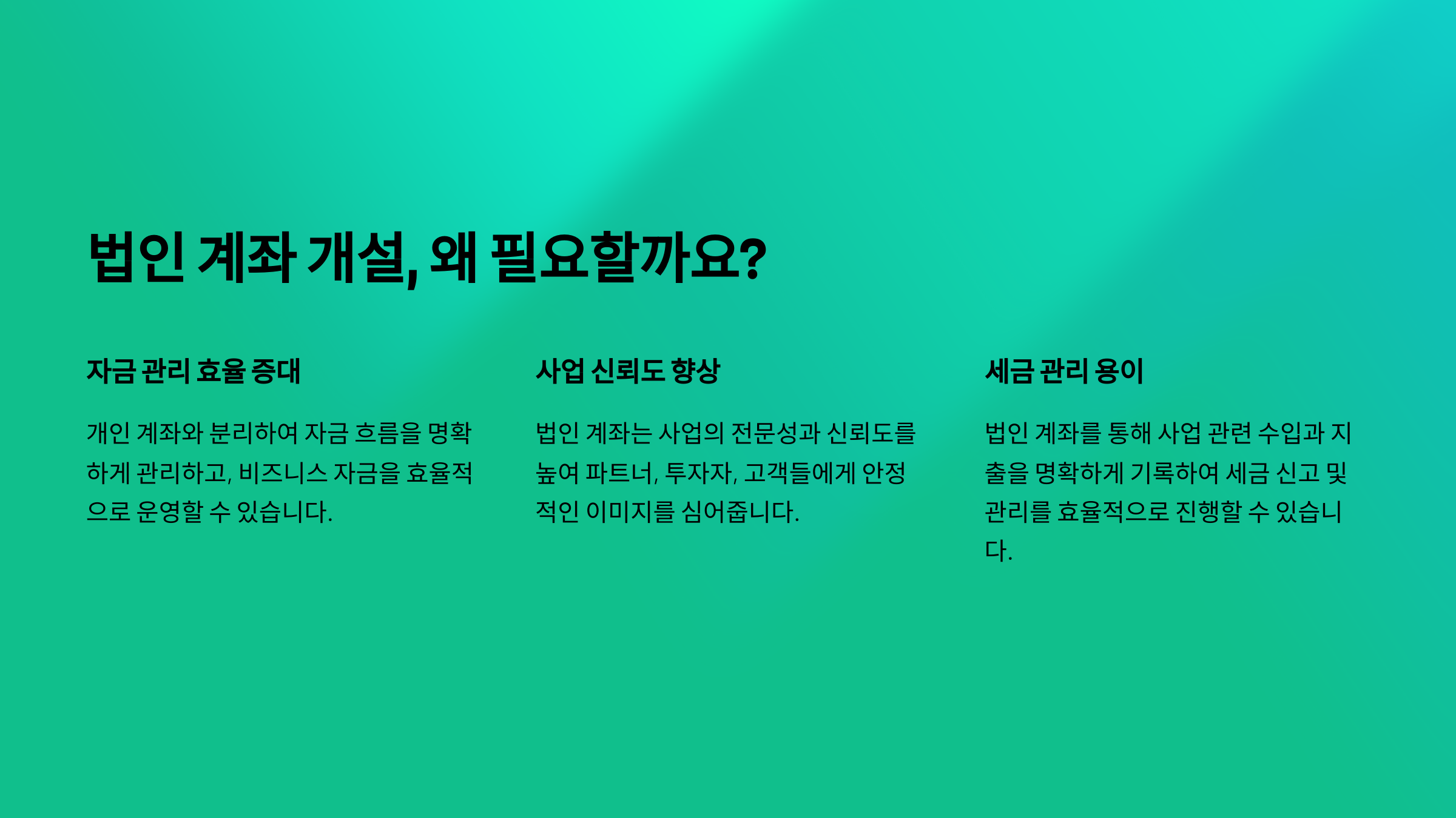 계좌 개설 완료: 심사를 통과하면 법인 계좌가 개설되고, 인터넷 뱅킹이나 체크카드 등의 서비스도 신청할 수 있어요.
