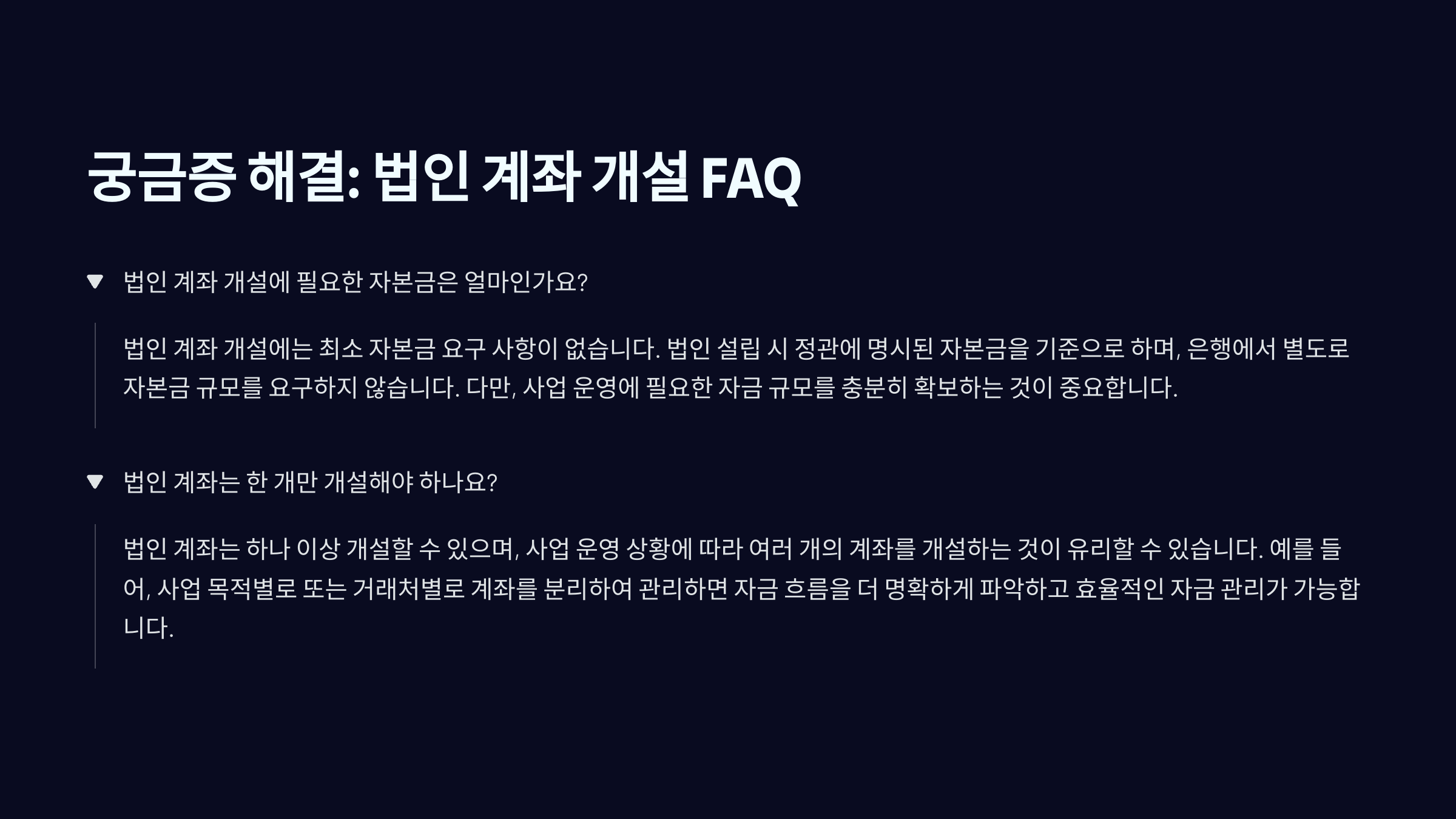 은행마다 법인 계좌 개설 시 요구하는 조건과 절차가 다릅니다. 일부 은행은 신규 법인의 경우 일정 기간 운영 내역이 있어야 계좌 개설을 허용하는 경우도 있으므로 미리 확인하는 것이 좋습니다.