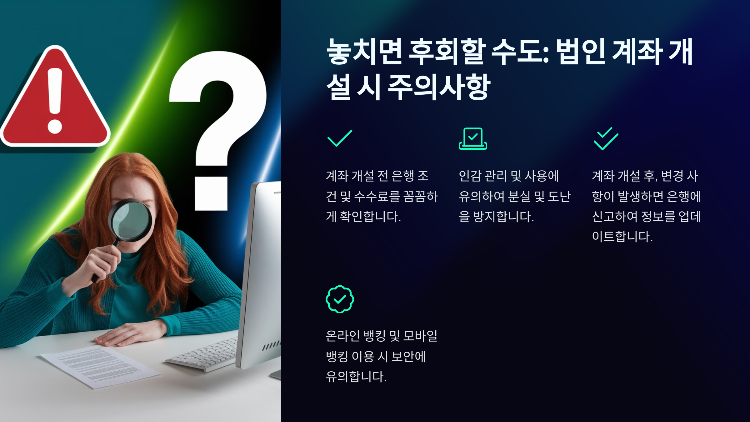 법인 계좌를 개설할 때는 여러 가지 주의해야 할 사항이 있습니다. 계좌 개설이 거절되는 경우도 있으므로, 아래 내용을 숙지하여 불필요한 문제를 방지하세요.