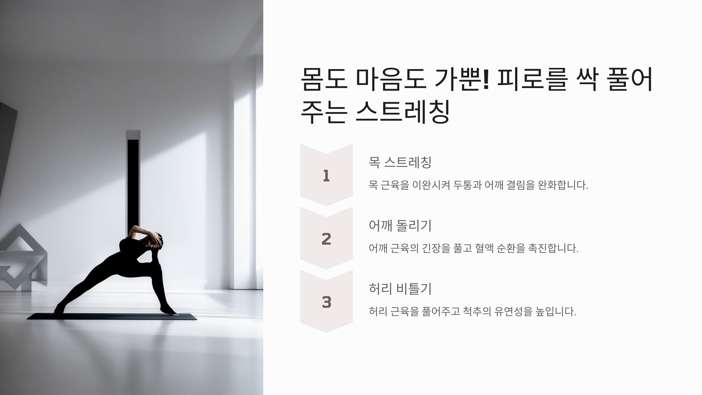 스트레칭을 하면 근육의 긴장이 풀리고 혈액순환이 활발해져서 피로가 한층 줄어듭니다. 간단한 스트레칭 동작만으로도 신체 에너지를 회복하고 피로를 완화할 수 있어요.
