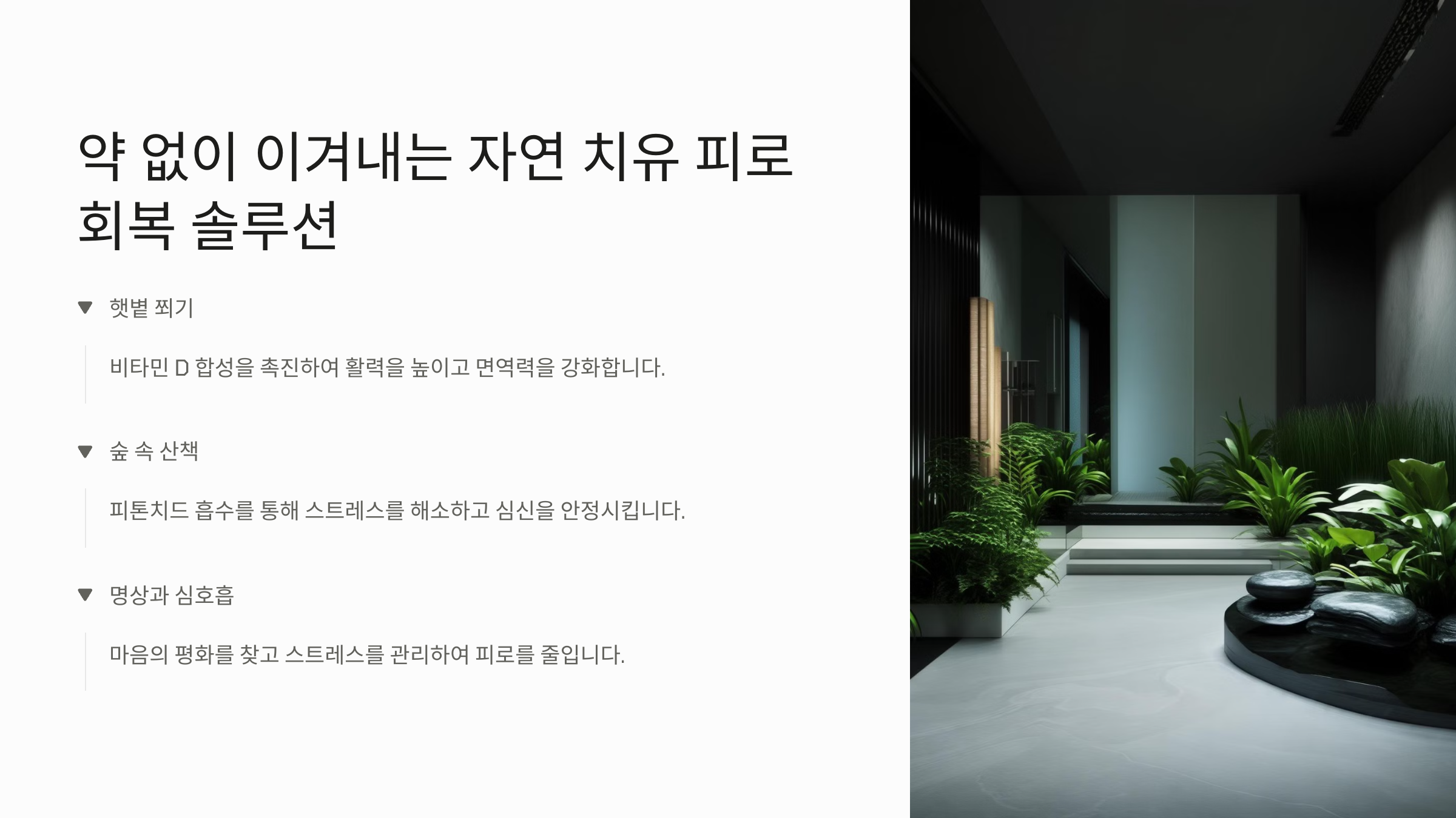 자연에서 얻을 수 있는 건강한 식품과 생활 습관을 통해 피로를 효과적으로 회복할 수 있어요.