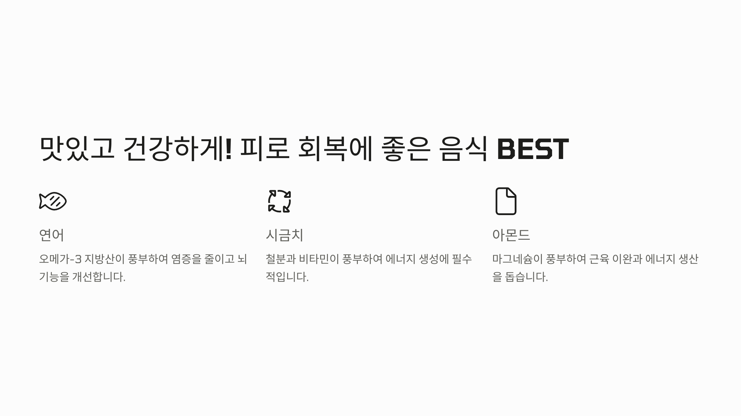| 연어 | 오메가-3, 단백질 | 몸의 염증 감소 |