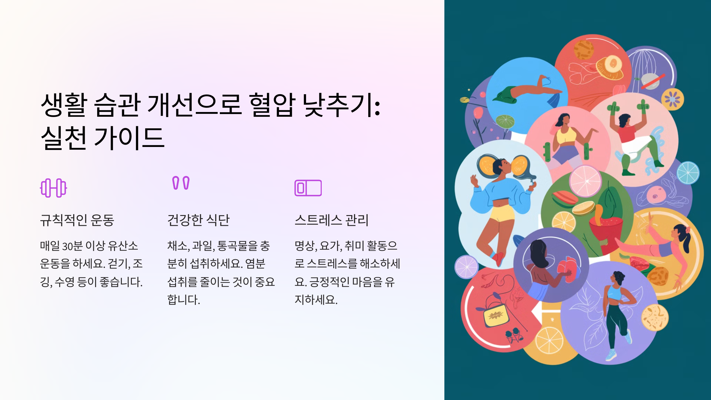 위의 생활습관을 실천하면 혈압을 효과적으로 낮출 수 있어요. 특히 운동과 식단 관리는 가장 중요한 요소 중 하나랍니다! 💪