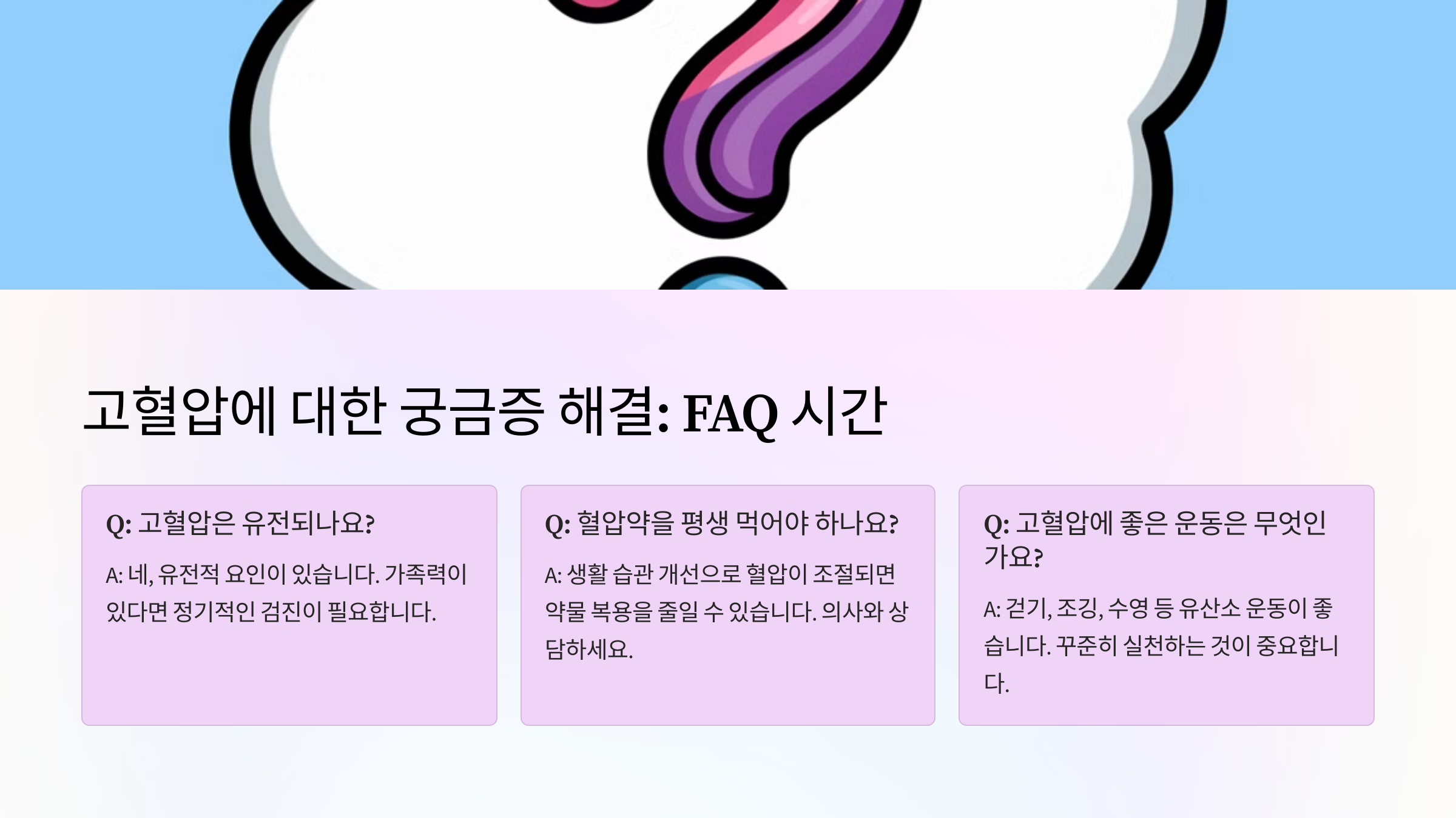 A1. 네, 가족 중 고혈압 환자가 있으면 발병 위험이 높아질 수 있어요. 하지만 생활습관을 개선하면 충분히 예방할 수 있어요.