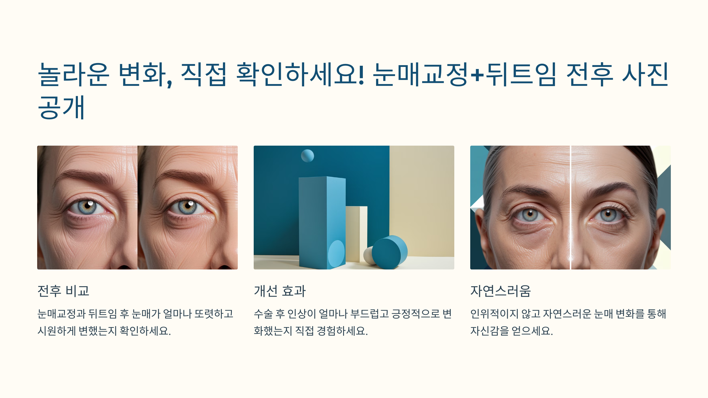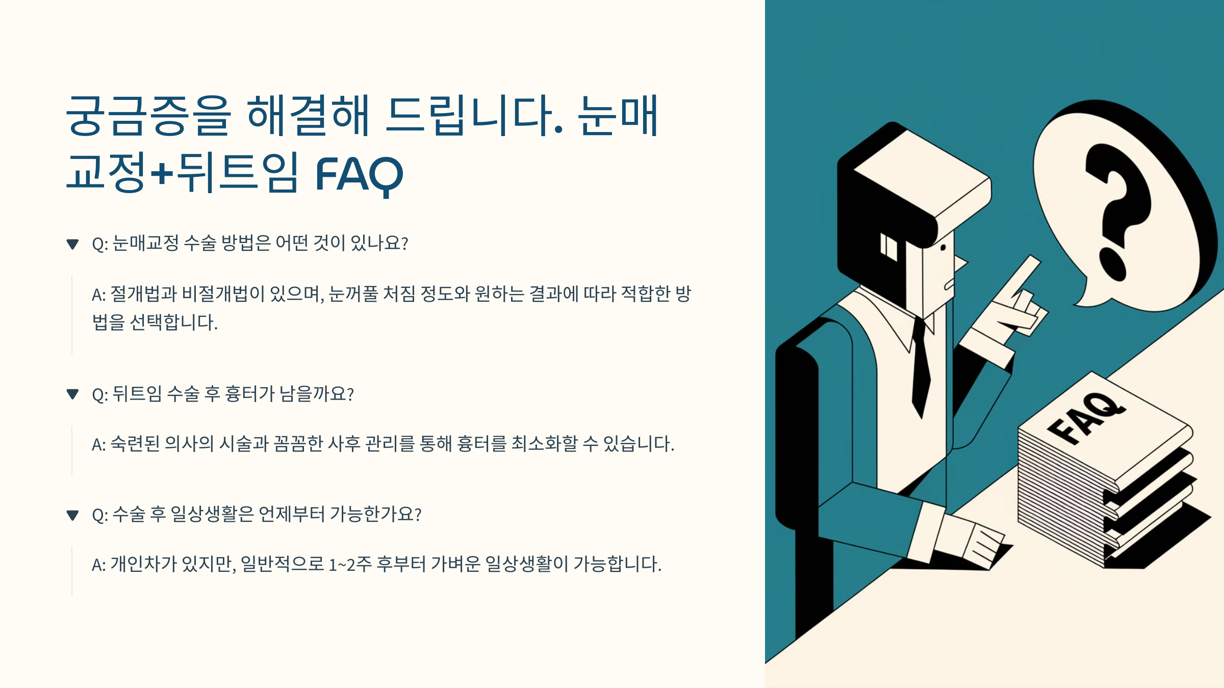 A3. 눈매교정은 영구적인 효과가 있으며, 뒤트임도 잘 관리하면 유지 가능해요.