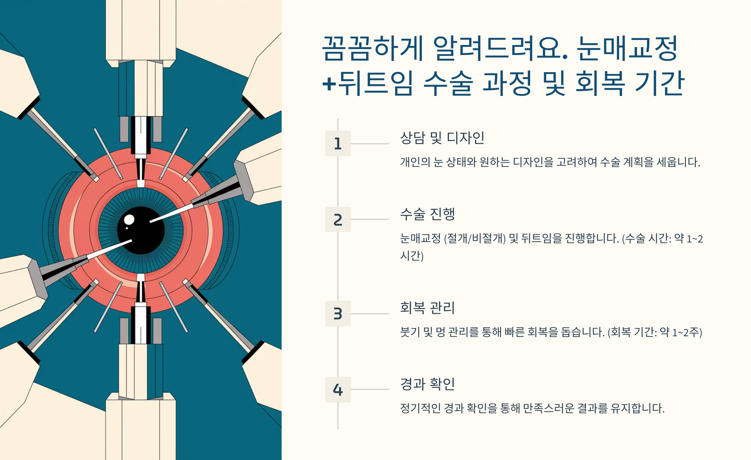 눈매교정과 뒤트임 수술은 비교적 간단하지만, 숙련된 기술과 정교한 계획이 필요해요.