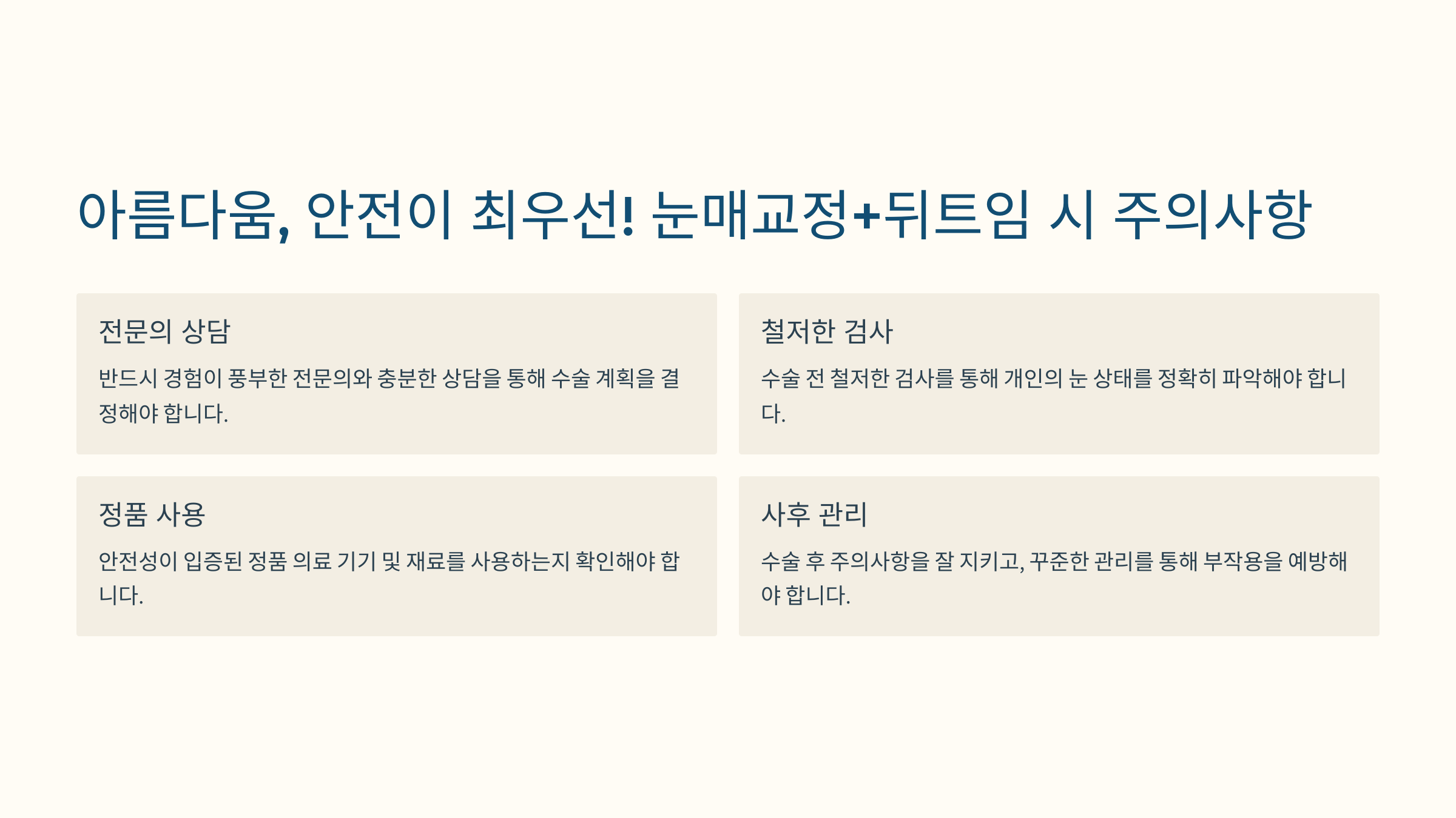 특히 졸린 인상이나 처진 눈매를 가진 분들은 눈매교정이, 짧고 답답한 눈매를 가진 분들은 뒤트임이 더 적합해요. 하지만 두 가지를 병행하면 더욱 만족스러운 결과를 얻을 수 있어요.