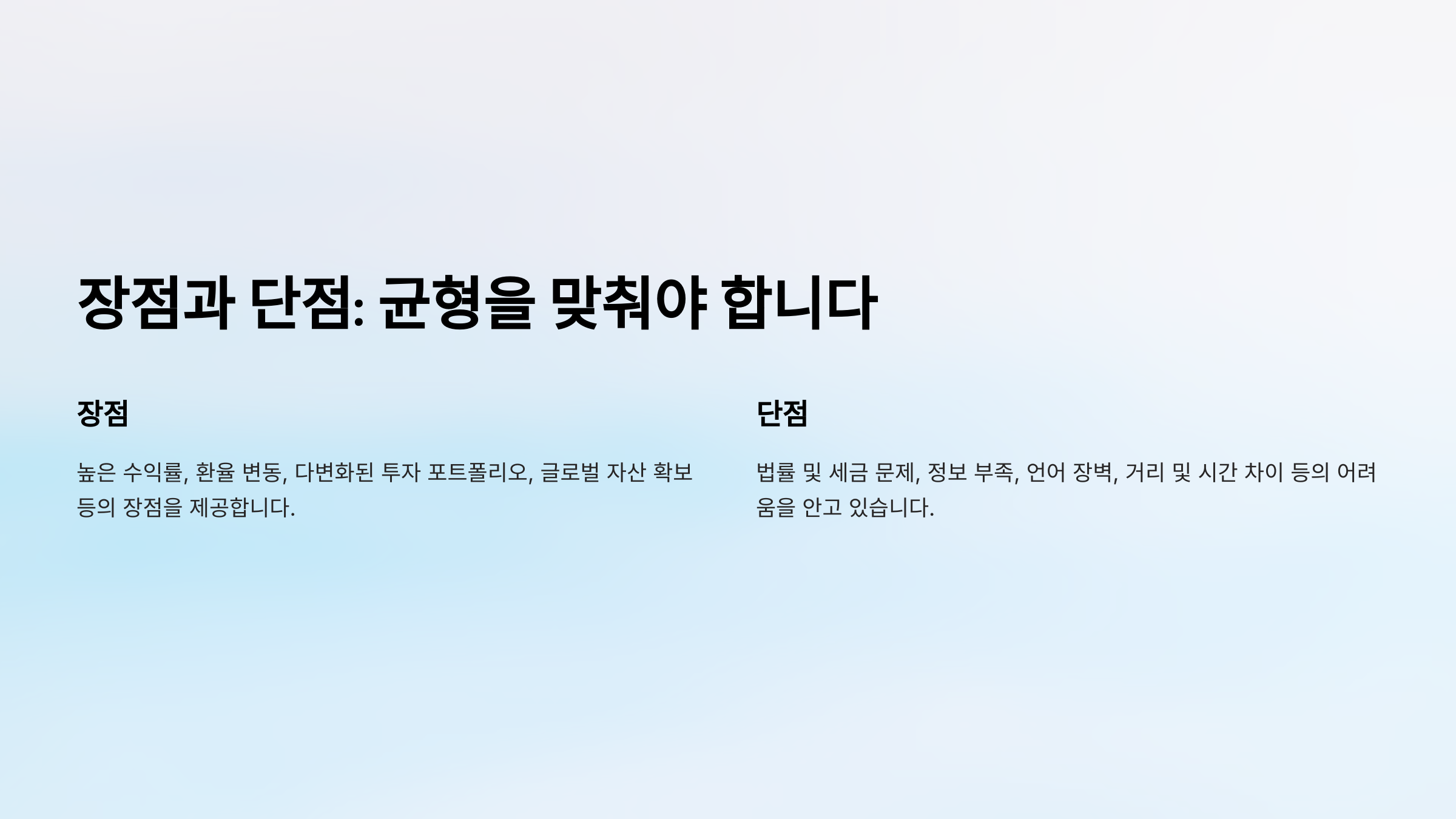하지만 단점도 분명히 있어요. 가장 큰 문제는 언어와 문화적 차이로 인한 커뮤니케이션의 어려움이에요. 투자 지역의 부동산 시장과 관련 규제를 정확히 이해하지 못하면 큰 손실을 입을 수 있어요. 게다가 환율 변동도 수익에 영향을 미칠 수 있다는 점을 유의해야 해요.