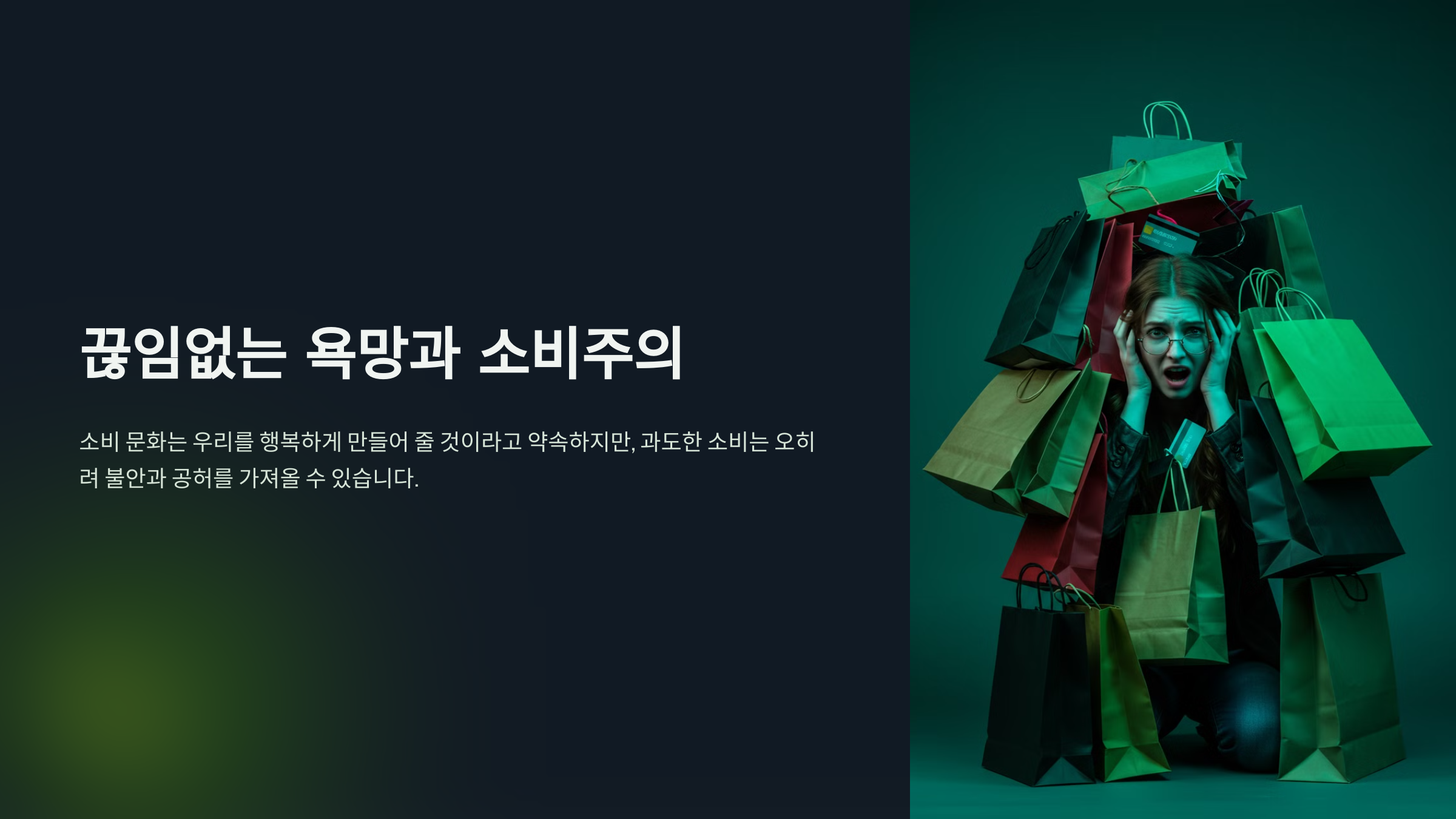 예를 들어, 스마트폰을 최신 기종으로 바꾸면 만족감을 느끼지만, 얼마 지나지 않아 더 좋은 모델이 출시되면 다시 갈망하게 됩니다. 이러한 끝없는 욕망의 순환 속에서 인간은 본질적으로 결코 완전히 충족될 수 없습니다.