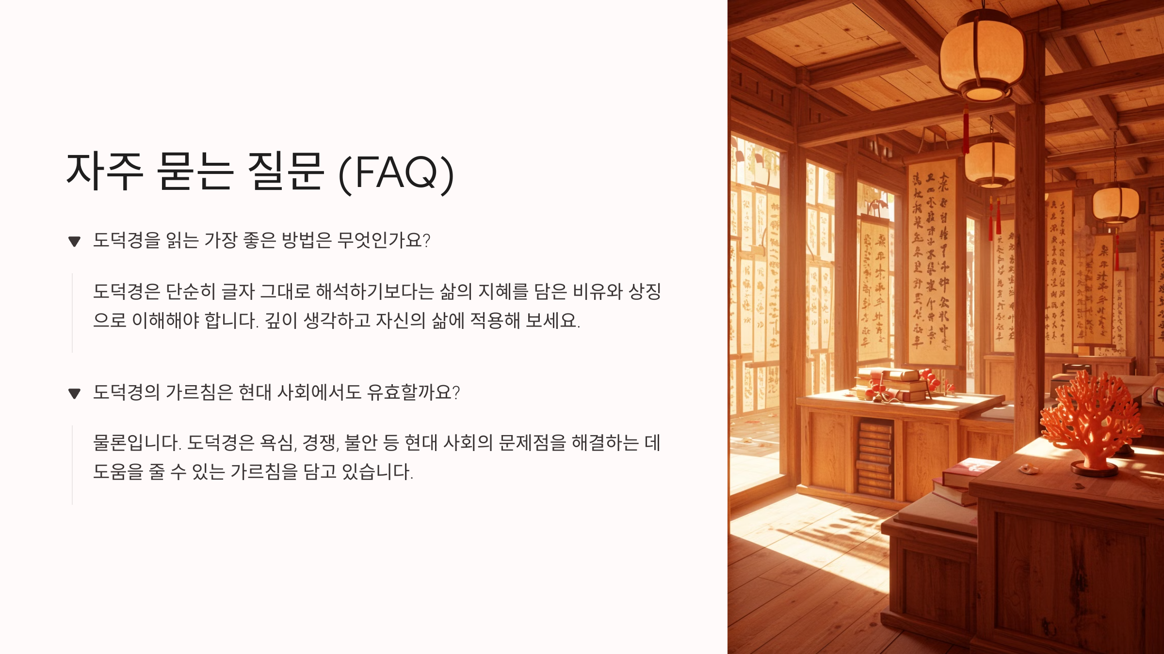 A1. 도덕경은 삶의 균형과 자연스러움을 강조해. 현대인의 스트레스와 경쟁에서 벗어나게 도와줄 수 있어.