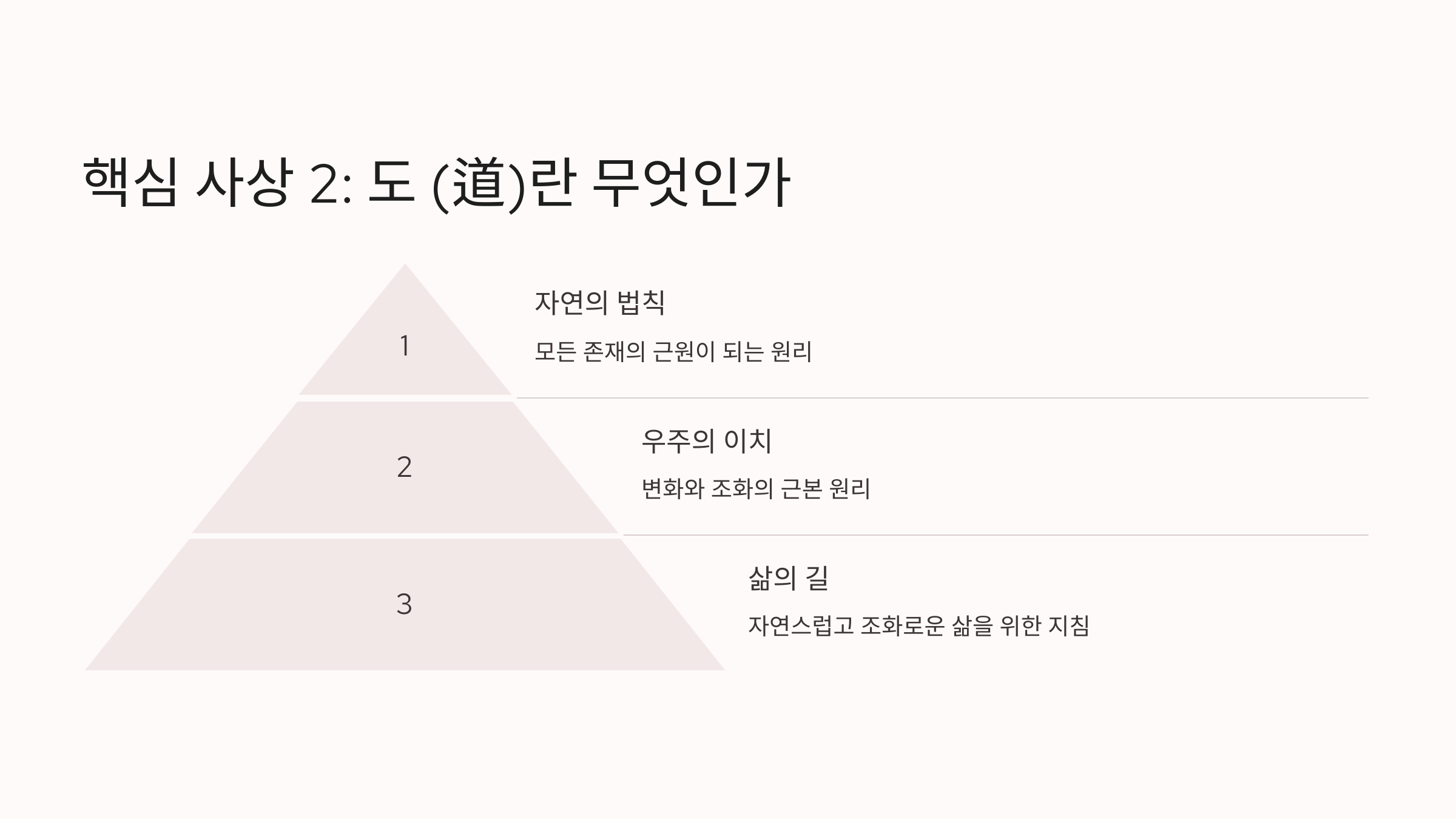여기서 '도(道)'는 세상의 근본 원리야. 모든 것은 자연스럽게 흘러가며, 억지로 바꾸려 하면 오히려 어긋나게 돼. '덕(德)'은 이 도를 따르는 삶의 태도를 의미해. 쉽게 말해, 물이 낮은 곳으로 흘러가듯 자연스럽게 사는 것이야.