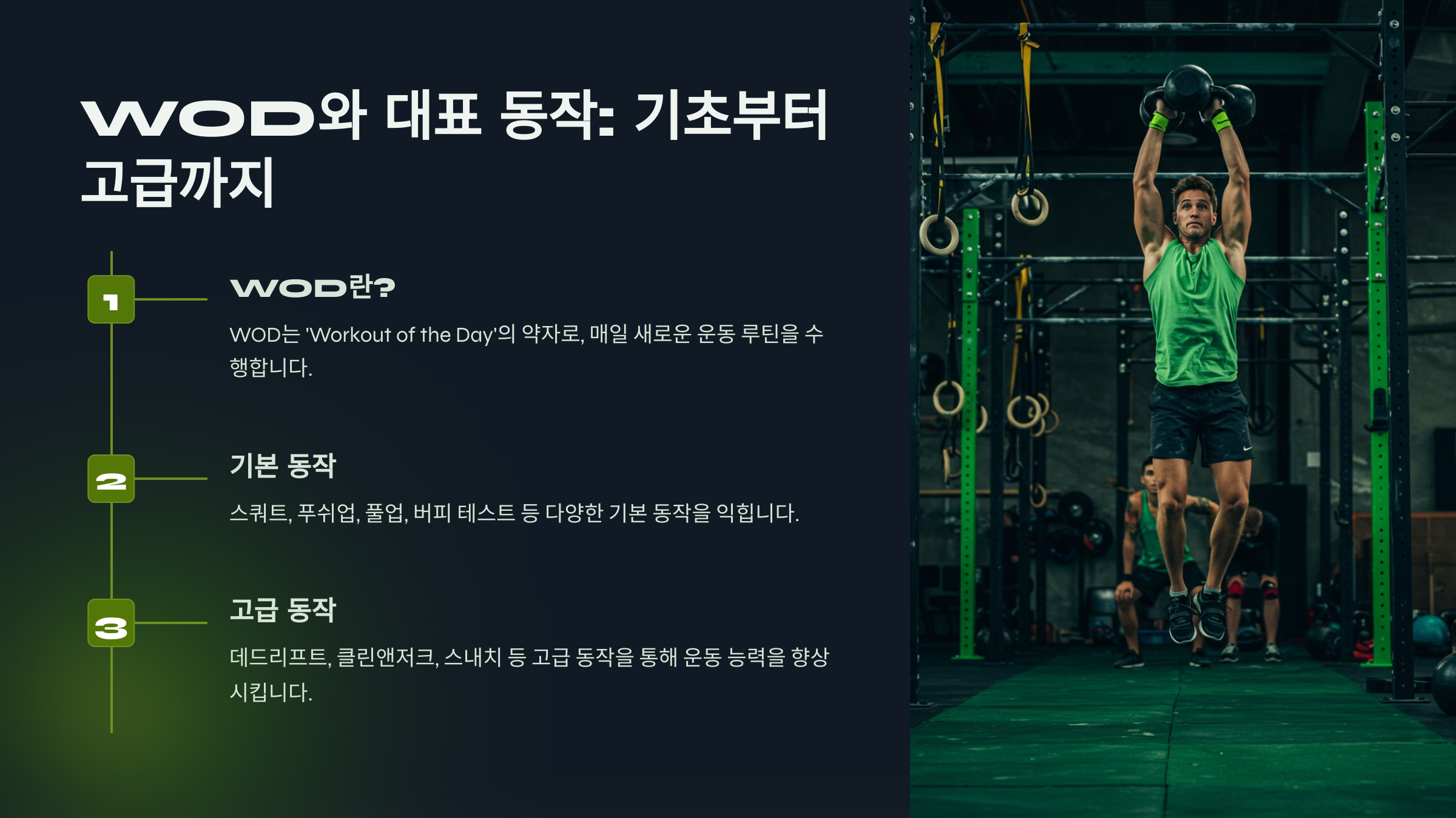 크로스핏에서는 매일 다른 운동 프로그램이 주어져요. 이를 **WOD(Workout of the Day)**라고 하는데, 매일 새로운 동작과 루틴을 경험할 수 있어서 **지루할 틈이 없어요**. 헬스장에서 반복적으로 같은 운동을 하는 것과는 완전히 다르죠!