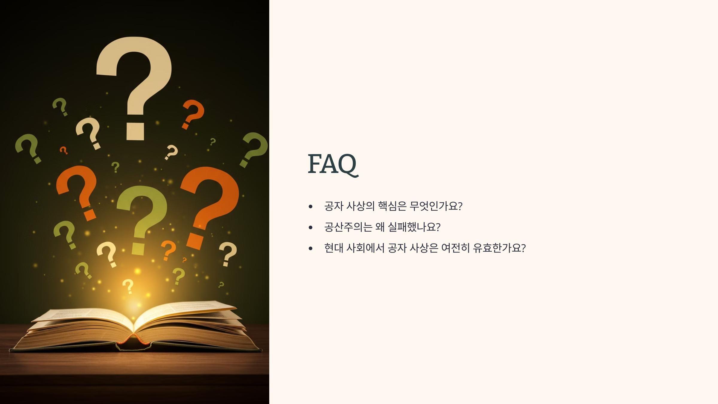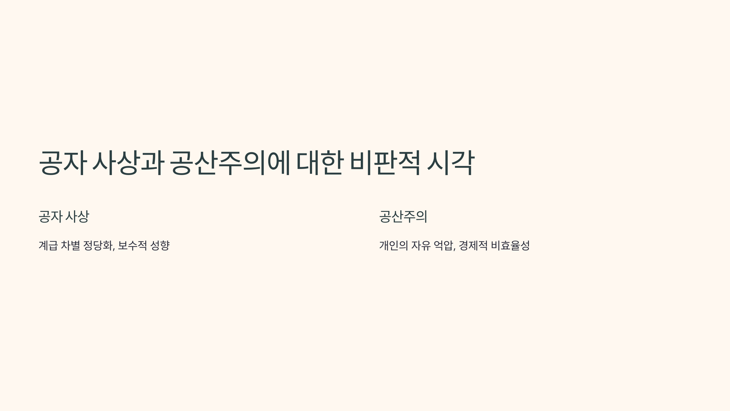 - 공자는 각자의 역할에 따른 조화를 강조했지만, 공산주의는 계급 철폐를 주장해요. 공자의 사상은 사회의 각 구성원이 자신의 역할을 수행함으로써 전체적인 질서와 조화를 유지하는 것을 목표로 했어요. 반면, 공산주의는 노동 계급과 자본 계급 간의 갈등을 해소하고 평등한 사회를 만드는 것을 목표로 하며, 이는 계급 자체를 부정하는 방식이에요. 공자는 상하 관계 속에서도 덕목을 강조하며 질서를 중시했지만, 공산주의는 계급투쟁을 통한 평등을 지향한다는 점에서 차이가 커요.