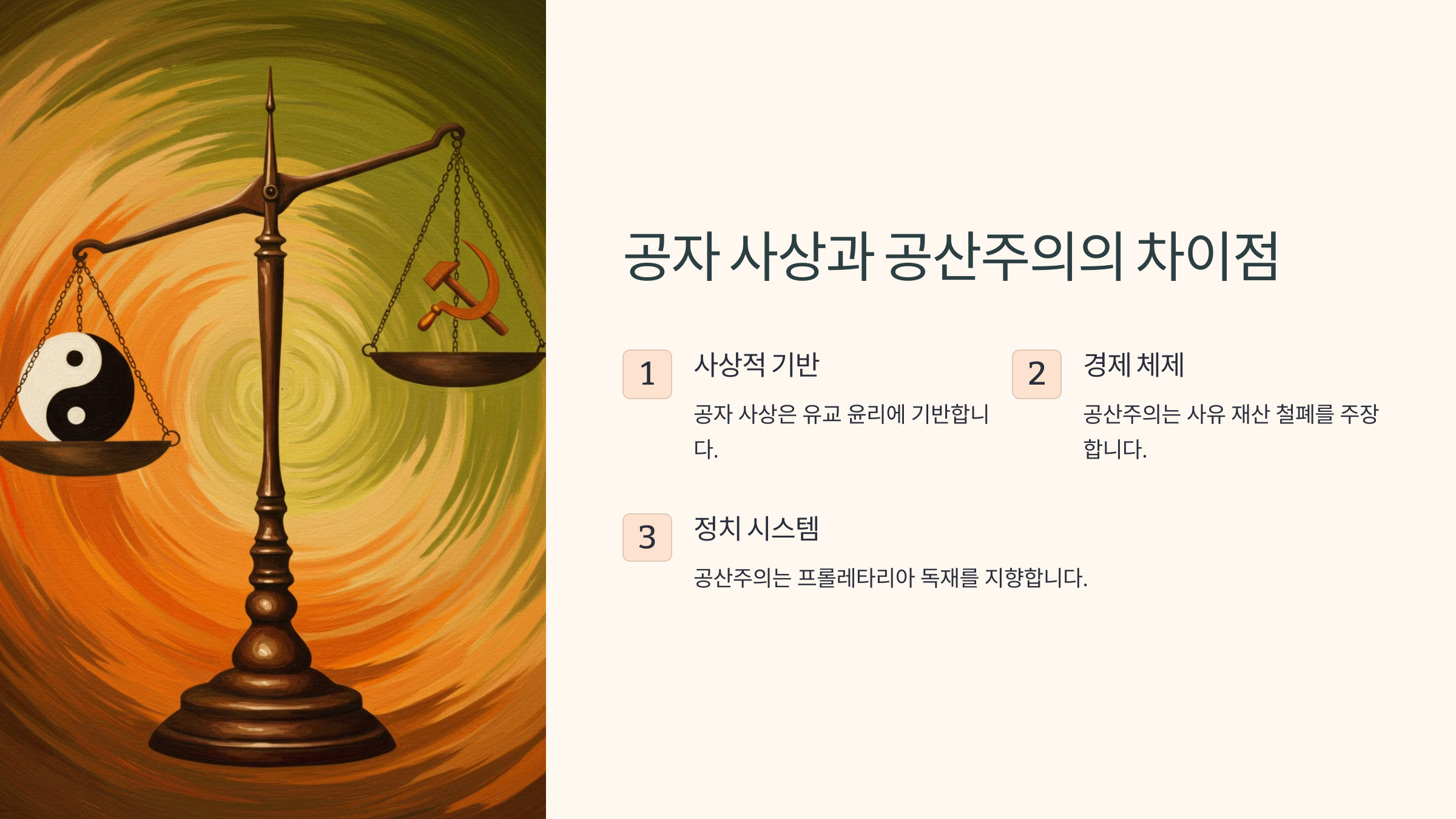 - 공자는 도덕적 경제를 강조했지만, 공산주의는 생산수단의 공유를 기반으로 경제를 운영해요. 공자의 사상에서는 경제적 활동도 도덕적 가치를 중심으로 이루어져야 하며, 부를 축적하는 과정에서 의(義)와 신(信)을 지켜야 한다고 보았어요. 이에 반해 공산주의는 경제적 불평등을 없애기 위해 생산수단을 사회 전체가 공유해야 한다고 주장해요. 공자의 경제관은 상업 활동을 부정하지 않으면서도 윤리적 경영을 강조하는 반면, 공산주의는 사유재산 제도를 부정하고 사회 전체의 부를 공유하는 체제를 지향해요.