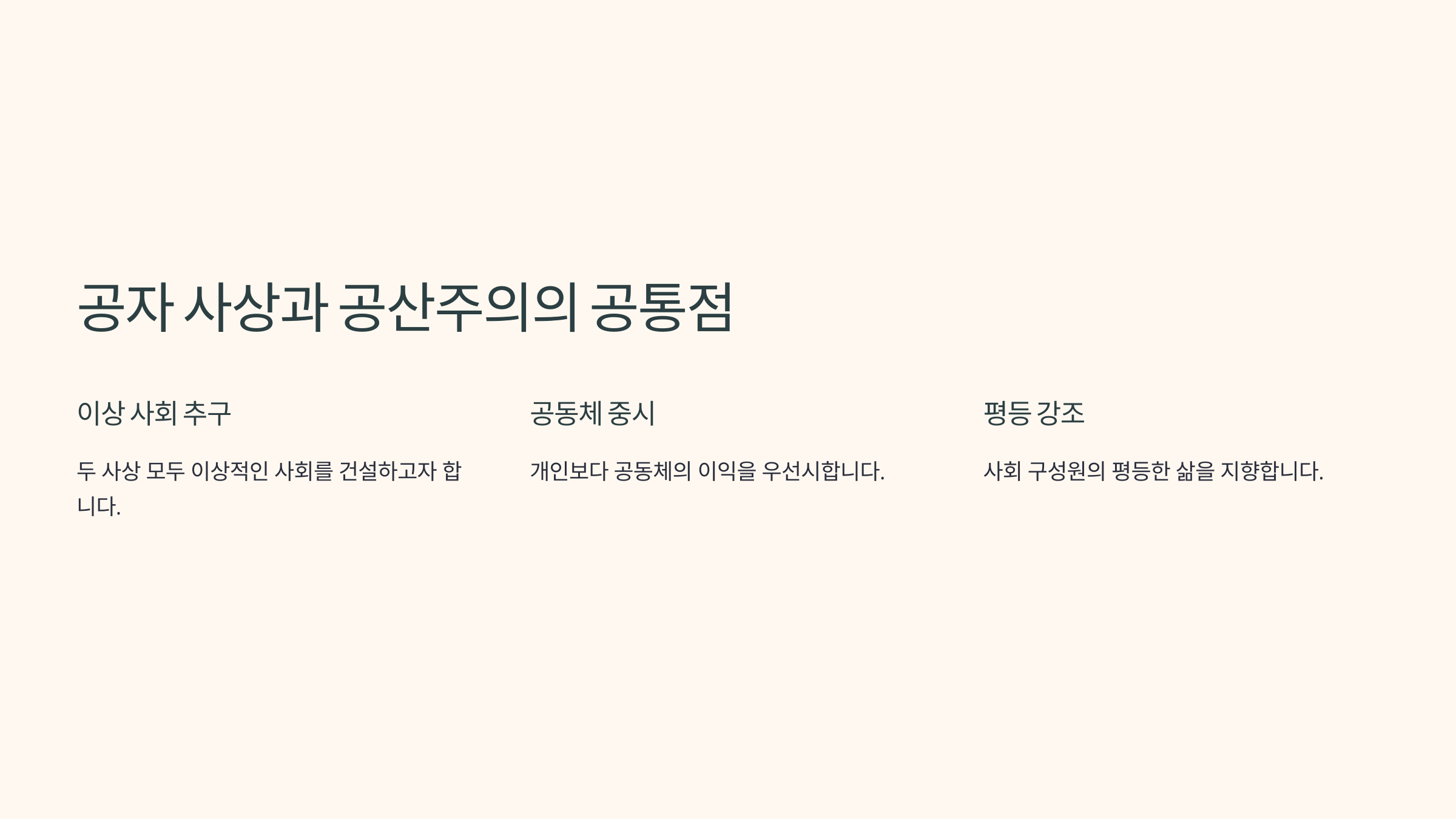 사회 구성원 간 신뢰를 기반으로 한 공동체 정신을 중시했어요. 이는 공산주의에서 강조하는 협력과 연대 정신과 연결될 수 있어요.