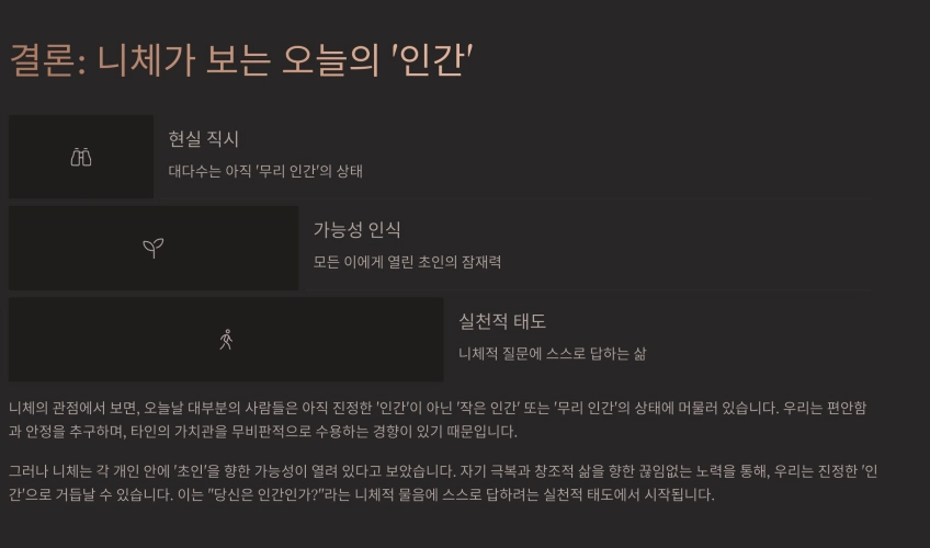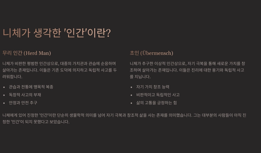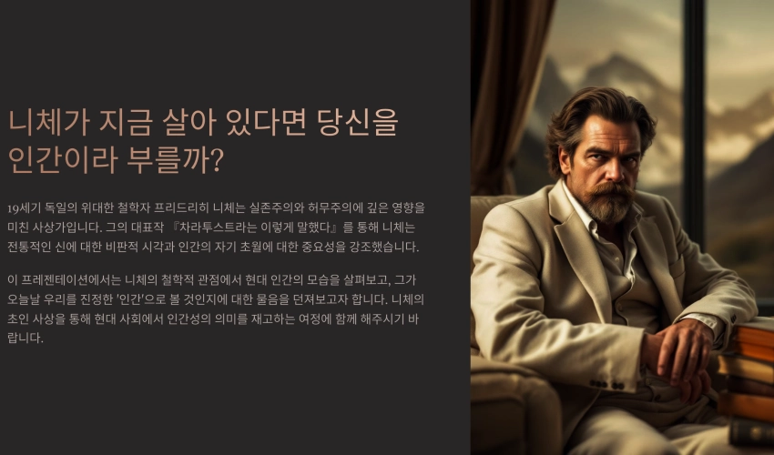 니체는 인간이란 단순한 생물학적 개체가 아니라, 스스로 삶의 의미를 창조하고 끊임없이 자신을 초월하는 존재라 보았습니다. 그는 인간을 하나의 과정으로 이해했습니다. 즉, 인간은 완성된 상태가 아니라, 끊임없이 되어가는 존재입니다. 따라서 인간으로 산다는 것은 끊임없이 자문하고, 자신의 삶을 실험하며, 새로운 가치를 창조하는 과정을 살아내는 것입니다. 우리는 니체가 말한 그런 인간으로 살아가고 있습니까? 아니면 이미 정해진 틀 속에서 주어진 삶을 수동적으로 살아가고 있습니까? 니체가 지금 우리 앞에 서 있다면, 그는 우리 각자에게 묻고 있을 것입니다. "너는 과연 인간인가?" 우리는 이 질문에 어떤 답을 할 수 있을까요? 인간이라는 이름을 스스로 자격 있게 지니고 있는가, 아니면 아직도 인간이 되기 위한 여정의 초입에 서 있는 미완의 존재인가? 니체는 우리에게 진정한 인간이 되기 위한 도전을 남겼습니다.