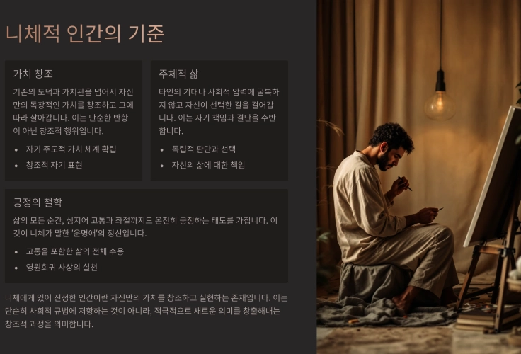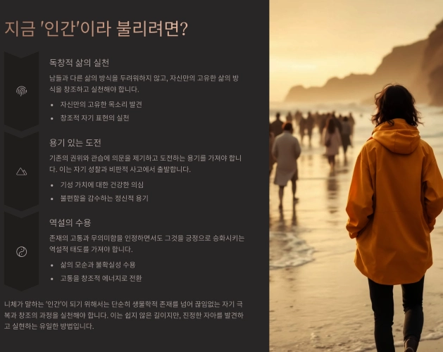 초인은 니체 철학의 중심 개념이며, 기존의 가치 체계를 초월한 새로운 인간형을 의미합니다. 초인은 무에서 의미를 창조하고, 삶의 고통과 허무를 넘어 끊임없이 자신을 극복하는 존재입니다. 니체는 영원회귀 사상을 통해, 우리가 지금 이 순간의 삶을 무한히 반복할 수 있다고 했을 때, 그 삶을 긍정할 수 있어야 한다고 말했습니다. 이 극단적 물음은 우리의 삶이 얼마나 충만하고 진정성 있는지를 시험하는 도전입니다. 우리는 우리의 삶을 있는 그대로 사랑하고, 그 모든 순간을 긍정할 수 있습니까? 초인은 자신의 삶을 예술 작품처럼 창조하며, 어떤 외부의 권위나 도덕에도 얽매이지 않습니다. 그는 스스로 법이 되며, 자신의 존재 이유를 삶 속에서 실현하는 자입니다. 오늘날 우리는 이 초인의 길에 들어섰습니까? 아니면 여전히 과거의 가치와 두려움에 묶여, 새로운 길을 두려워하는 평범한 인간으로 머물러 있습니까? 니체는 초인의 삶을 선택하는 것은 결국 우리 자신의 의지에 달려 있다고 말합니다.