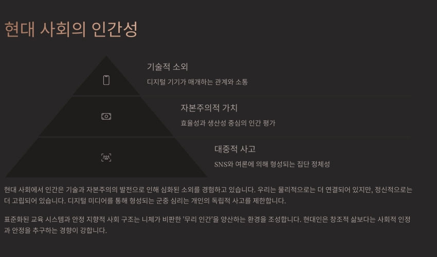 현대 사회는 눈부신 기술 발전과 자본주의적 가치관 속에서 새로운 형태의 인간상을 만들어 냈습니다. 우리는 정보의 바다 속에서 하루에도 수십 번씩 방향을 잃고, 소비와 쾌락을 삶의 목적으로 삼으며 살아갑니다. 니체는 이런 시대를 ‘허무주의’로 규정했습니다. 모든 전통적 가치가 붕괴하고, 인간은 삶의 근본적 의미를 상실한 채 방황하게 됩니다. 우리는 무엇을 위해 사는가? 단지 생존을 위한 노동과 소비, 타인의 인정만을 위한 삶이라면 그것이 과연 인간다운 삶일까요? 니체는 이런 삶을 경계하며, 인간은 스스로 존재의 의미를 재창조해야 한다고 말했습니다. 그는 물었습니다. "너는 왜 사는가?" 이 질문 앞에서 우리는 과연 어떤 대답을 할 수 있을까요? 니체는 인간이기를 포기한 자들은 단지 살아 있는 기계에 불과하다고 보았습니다. 그렇다면 지금 우리의 삶은 인간다운 것입니까? 아니면 인간성을 잃어버린, 단지 흐름에 떠밀리는 생존의 연속입니까?