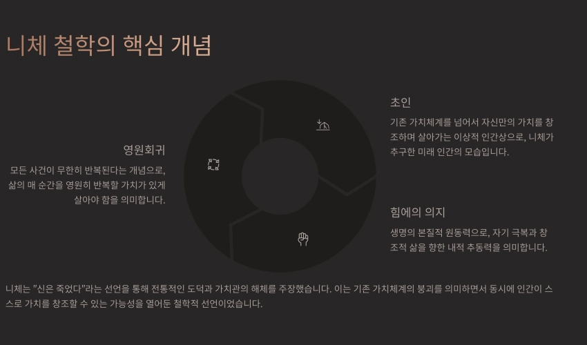 니체의 철학에서 가장 널리 알려진 문장은 "신은 죽었다"는 선언입니다. 그러나 이 말은 단순히 종교의 쇠퇴나 무신론적 선언으로 해석되어서는 안 됩니다. 니체가 말한 ‘신의 죽음’은 인간 사회 전반에 걸쳐 통용되어 온 절대적 가치 체계의 붕괴를 의미합니다. 즉, 신에 의해 부여된 도덕, 진리, 질서의 상실은 인간이 이제 그 권위를 잃은 가치들 속에서 방황하게 되었음을 의미합니다. 이로 인해 인간은 자신의 삶과 세계에 의미를 스스로 부여해야 하는 존재로 남게 되었습니다. 니체는 이러한 상황을 허무주의의 시작으로 보았고, 그 해결책으로 초인의 등장을 제시합니다. 초인은 기존의 가치들을 넘어 새로운 의미를 창조하는 자입니다. 그렇다면 우리는 이러한 초인의 이상을 실현하고 있는가? 현대의 인간은 과연 신 없는 세계에서 스스로 의미를 창조하는 자율적 존재로 살아가고 있는가? 아니면 여전히 과거의 도덕과 질서에 의존하며, 새로운 시대에 맞지 않는 가치들에 얽매여 있는가? 니체는 우리 각자에게 이 물음을 던지고 있습니다.